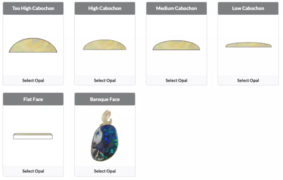 Most often dictated by the rough form. Most Opals, particularly Black Opals, tend to be fashioned as ovals and because Opal is cut ‘en cabochon’ or with a domed surface these features have traditionally been preferred for jewellery aesthetics and calibration purposes. However, most Boulder Opals are cut as free shapes which can lend themselves to more distinctive designs. In the last decade there has been a strong trend towards cutting freeform 3-dimensional shapes from most gem quality Opal. By sculpting the rough, yield may be maximised in terms of weight and spread, aesthetic talent must be applied to balance the stones’ lapidary design.