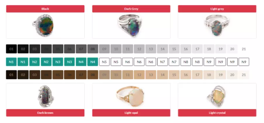 The “Variety” of an Opal is determined by where the Opal Body Tone is located within the Body Tone Chart. Opal that has a body tone of N1-N4 is defined as “Black Opal”. Opals mined in the “Mintabie” fields in South Australia have been known to produce excellent quality Black Opal, however, they are more famous for “Dark Opal” or “semi-Black” or “Grey” Opal, terms used to describe Opals with body tones lighter than N4. Whether an Opal is a black or not can be determined by merely examining the face of the stone. All colours are ignored and the overall body tone (blackness level) is estimated. This is compared to the scale of blackness shown below, stones achieving values of N1 to N4 on this scale are considered Black Opals – attracting the additional value associated of this class of Opal.
