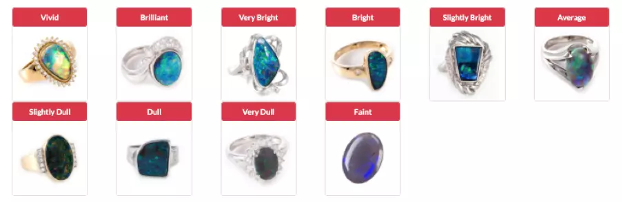 Refers to the dominance of hue in the fire colour. Rich saturated hues; emerald green, rich orange, etc. are always present in the finest gem quality stones yet even pastel tones if bright can make a top quality stone. Conversely subdued brightness and pale pastel hues can only indicate, at best, a commercial quality stone. The finest Opals hold their beauty in all types of light.