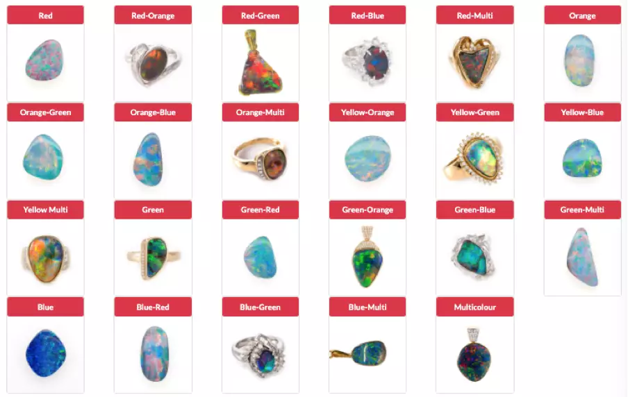 Red Opal is the rarest and most valuable and a predominantly red stone may potentially display all of the spectral colours; if so, it may be referred to as ‘multi-red’. Bearing in mind that absolute value depends on brightness, pattern and body tone; red and multi-coloured opals are rarer than green-orange, blue-green and blue opals, in that order. Given all other factors are equal an opal containing red can be valued greater than a blue-green-yellow opal by a factor of up to 3 times.