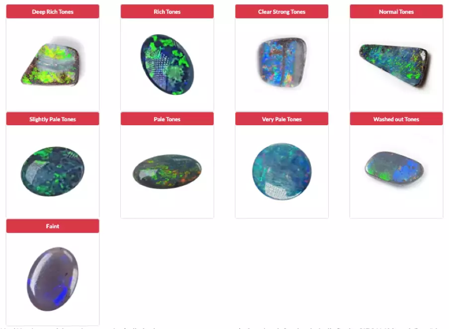 The body tone of an opal is different to the play-of-colour displayed by precious opal. Body tone refers to the relative darkness or lightness of the opal, while ignoring its play-of-colour. To determine the body tone of an opal one examines the piece of opal, face-up, and determines (by visual comparison) its position in the scale of body tone. If the tone of the opal appears darker than N4, then the opal may be classified a black opal. Consequently, any opal with a body tone darker than N4, irrespective of hue, can correctly be termed black opal. Some boulder opal possesses this body tone, so it is very correctly termed black boulder opal. It is also appreciated that some very dark red Mexican-type opals would have dark enough body tones to be categorised as black opal. If the opal is lighter than N4, and its tone corresponds to N5 or N6 on the scale of body tone, then it is classified as dark opal. If, in addition, this opal has a decided hue colour, it is additionally classified as, for example, a dark blue opal. If, on the other hand, the tone of the opal corresponds to N7, or lighter, it is classified as light.